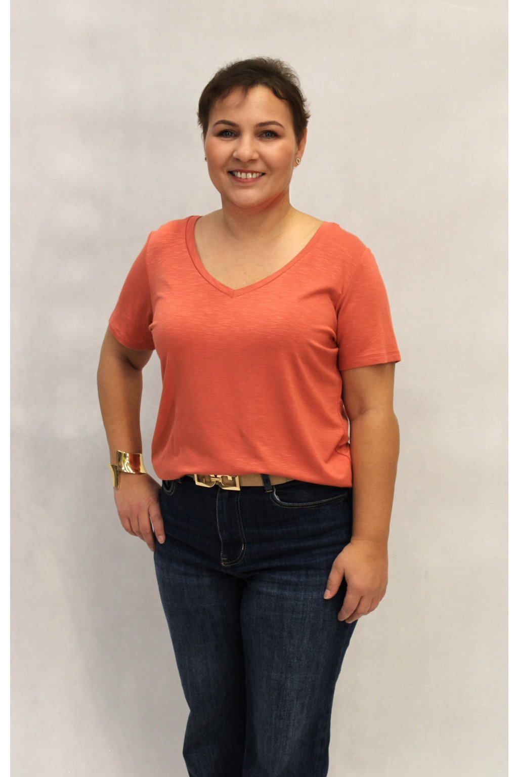 Jemnost, která vám učaruje! Naše nové meruňkové triko s nepatrným plastickým vzorem je dokonalou volbou pro každou příležitost. Užijte si precizní výstřih do V a materiál, který je radost nosit. Elegantní, svěží a neuvěřitelně pohodlné – přesně takové je naše meruňkové triko.