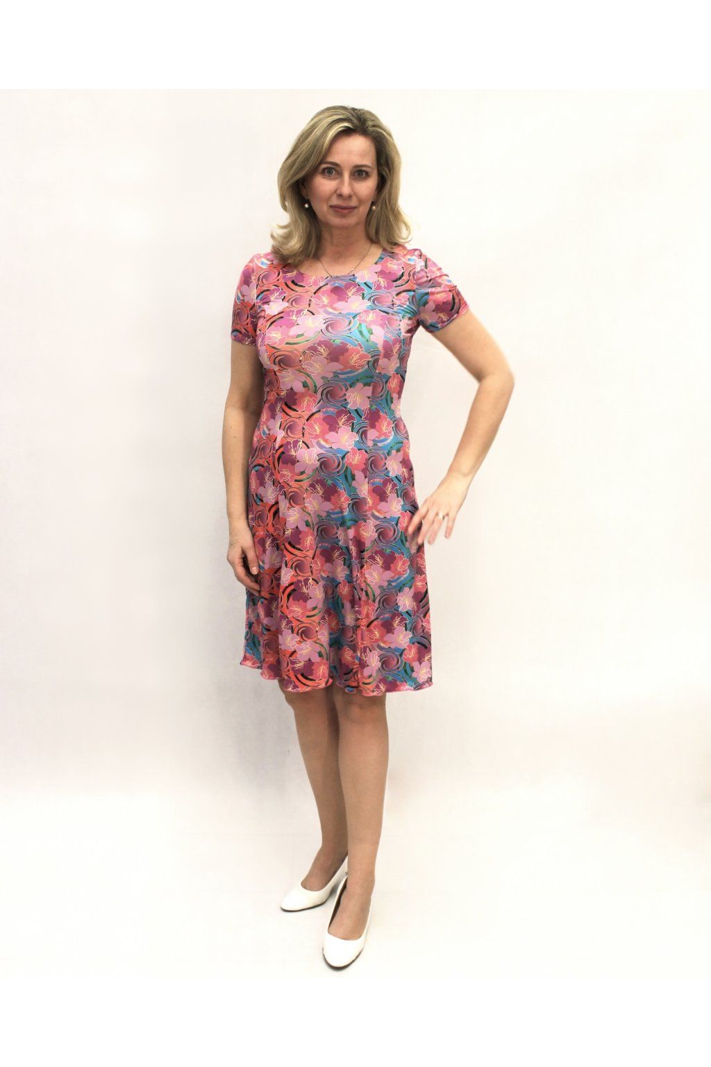 Letní šaty, které vám dodají šarm. Propracovaný princesový střih s plynule se rozšiřující sukní bez dělení v pase nádherně vytvaruje ženskou postavu a zajistí naprostou volnost pohybu i postavám s výraznějšími boky. V tomto modelu budete zářit. Je to ideální kousek pro sebevědomé ženy, které milují barvy a nebojí se být středem pozornosti.