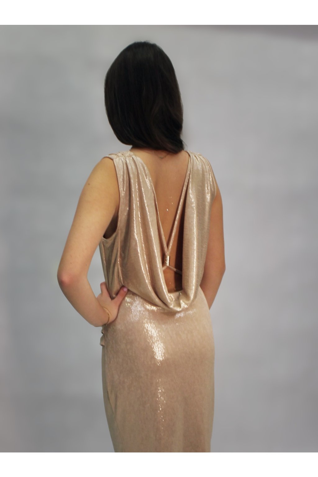 Hledáte šaty, které v sobě spojují eleganci a "wow" efekt? Tyto zlaté šaty s odhalenými zády a lichotivým řasením jsou přesně to, co potřebujete. Buďte nepřehlédnutelná na každém večírku!